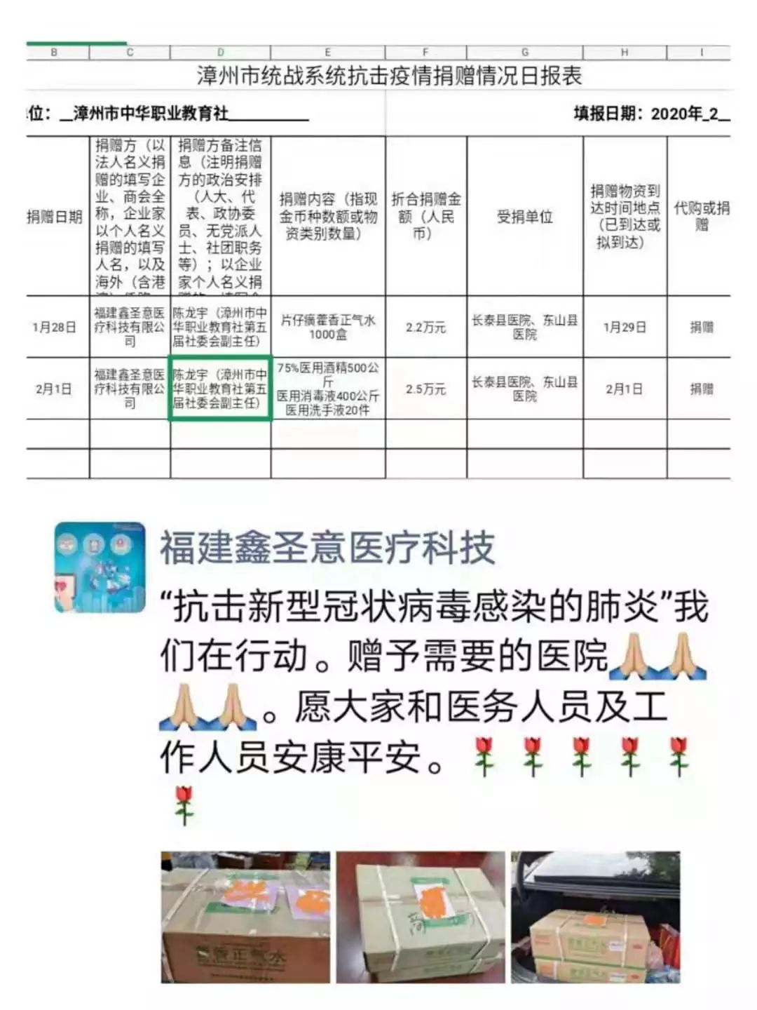 漳州市中华职教社副主任陈龙宇捐赠藿香正气水,医用酒精和医用消毒液,给需要防控抗击新型冠状病毒感染肺炎疫情的医院,价值4.7万元。