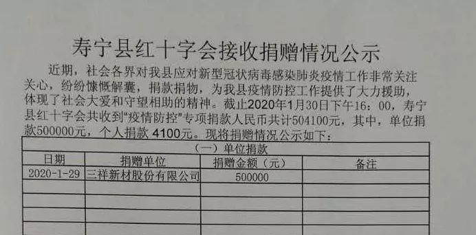 寿宁县中华职业教育社社员杨辉担任总经理的三祥新材股份有限公司慷慨解囊,公司董事会同意通过寿宁县红十字会给予"疫情防控"专项捐款50万元。