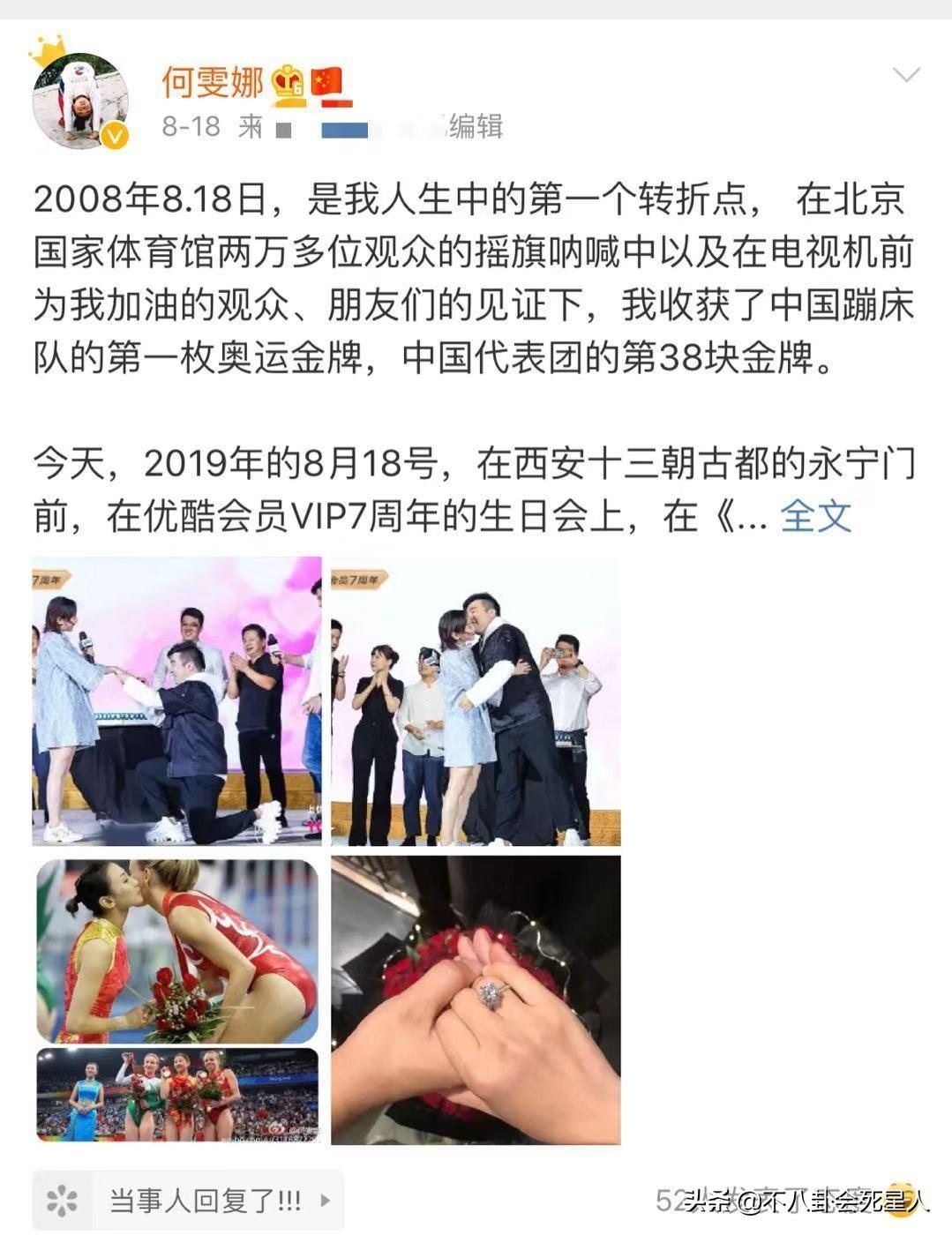 近日,何雯娜在微博发布了一条长文,称8月18日对自己来说是转折点,2008年的8月18日,自己获得奥运。而今年的8月18日,自己被求婚,进入人生第二个起点。